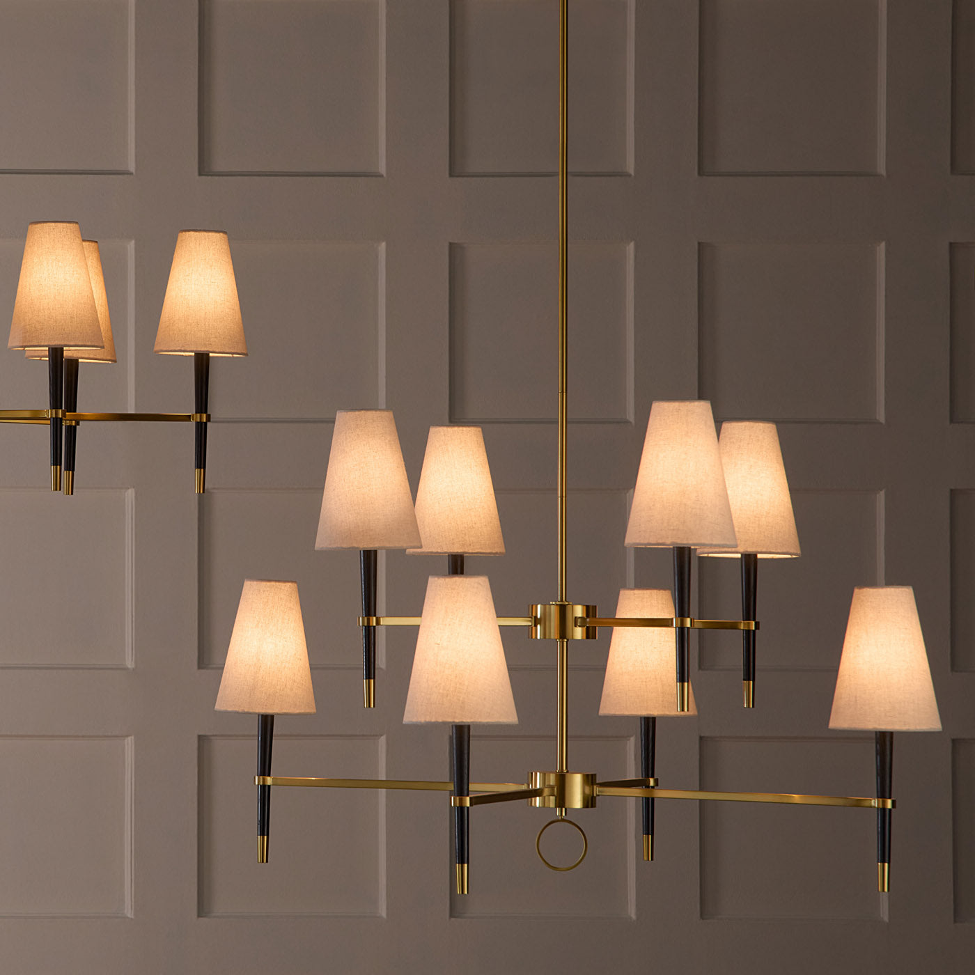 Our Ventana Two-Tier Chandelier is elegant and ladylike in ivory wood with polished nickel accents or timelessly handsome in ebonized wood with antiqued brass or polished nickel accents. Topped with natural linen shades.